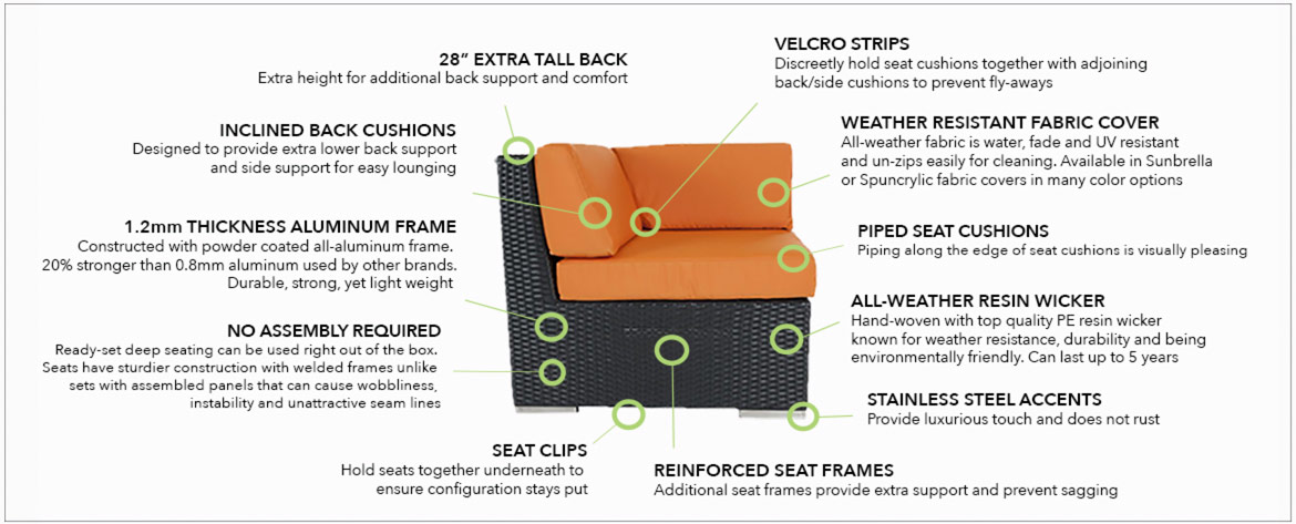 Personalize your furniture to suit your style. Choose from a wide selection of cushion color options in Sunbrella and Spuncrylic fabric. Both fabrics are UV resistant, stain resistant and water repellent and meant for the outdoors.
